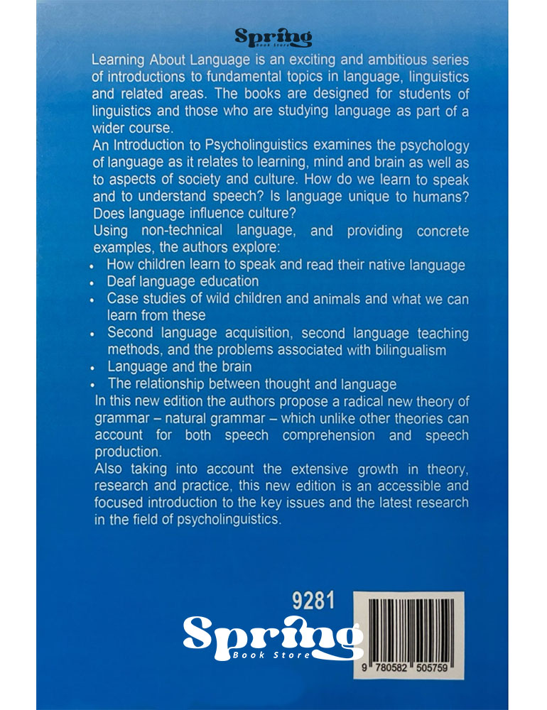 An Introduction to Psycholinguistics یکی از منابع پایه و معتبر در حوزهی روانزبانشناسی است که به بررسی رابطهی بین زبان، ذهن و مغز انسان میپردازد. در این کتاب، نویسنده تلاش میکند با زبانی سادهتر اما علمی، فرآیندهایی مانند درک و تولید زبان، یادگیری زبان، رشد زبانی کودک و رابطه زبان با تفکر را بررسی کند.ویرایش دوم این کتاب با بازبینی کامل مطالب، گرافها و مثالهای جدید بهروزرسانی شده و به نیازهای آموزشی دانشجویان رشته زبانشناسی یا روانشناسی زبان پاسخ میدهد.