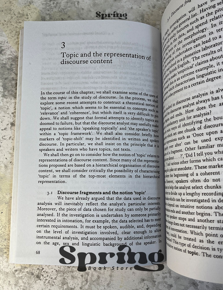 کتاب Discourse Analysis نوشتهی Gillian Brown و George Yule یکی از منابع کلاسیک و اصلی برای آشنایی با تحلیل گفتمان (Discourse Analysis) است. این اثر به شکلی سیستماتیک مفاهیم کلیدی، روشهای تحلیل و کاربردهای عملی تحلیل گفتمان را معرفی میکند و برای دانشجویان و پژوهشگران رشته زبانشناسی، آموزش زبان انگلیسی، ترجمه، و ارتباطات بسیار مفید و قابل استناد است.نویسندگان تلاش کردهاند در کنار ارائهی تعاریف نظری، از مثالهای واقعی و ملموس برای روشنتر شدن مفاهیم استفاده کنند.