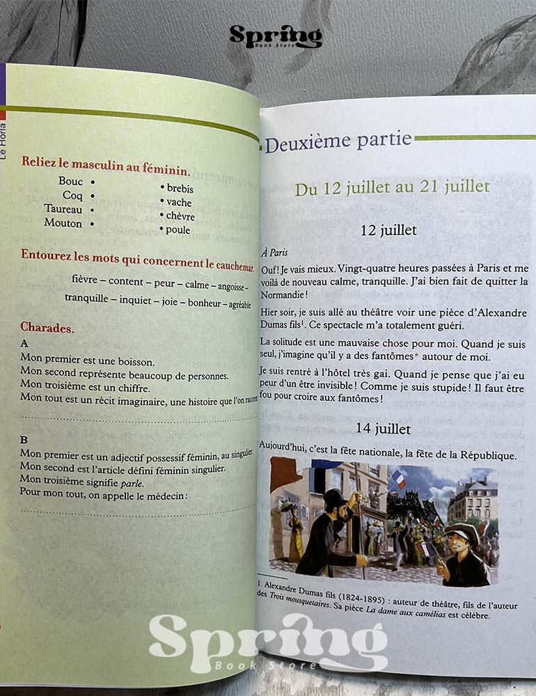 «هورلا» یکی از مشهورترین داستانهای گای دو موپاسان است که فضای رازآلود و ترسناکی دارد. داستان از زبان یک مرد روایت میشود که به تدریج احساس میکند موجودی نامرئی و مرموز وارد زندگیاش شده است. این موجود که «هورلا» نامیده میشود، بر ذهن و جسم او تسلط پیدا میکند و کمکم عقل و آرامش او را از بین میبرد. مرز میان واقعیت و توهم در این داستان به شکلی هنرمندانه محو میشود و خواننده را در تعلیقی عمیق فرو میبرد.این کتاب نسخهای سادهشده از داستان اصلی است که برای زبانآموزان طراحی شده و با جملات روان، لغات توضیح دادهشده و CD صوتی، فرصتی عالی برای تقویت مهارت خواندن و شنیدن به زبان فرانسوی فراهم میکند.